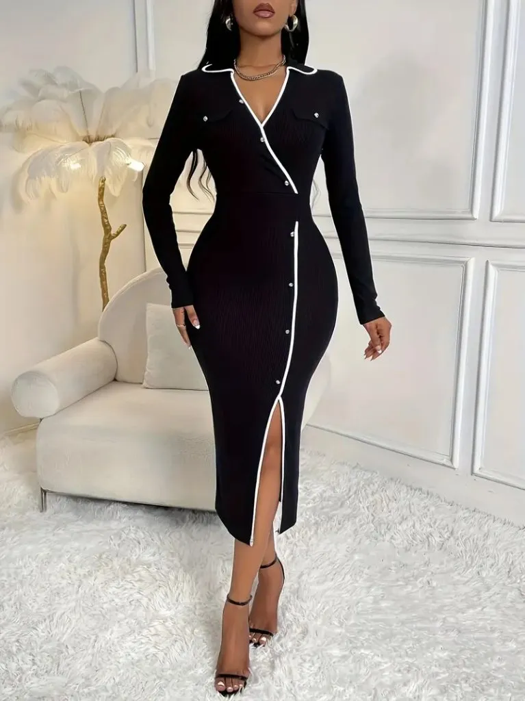 فستان تريكو واسع بياقة عالية وفتحة أمامية للنساء - Beyond Store