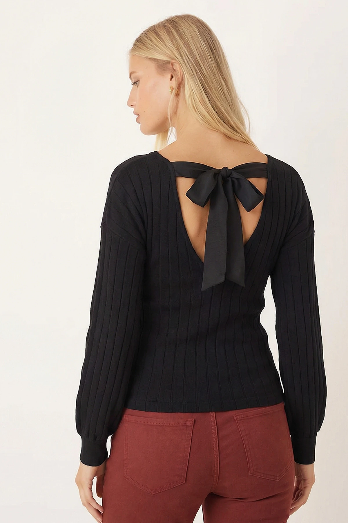 بلوزة تريكو مخططة بياقة دائرية وأكمام طويلة لإطلالة يومية كيوت ودافئة بالموسم.