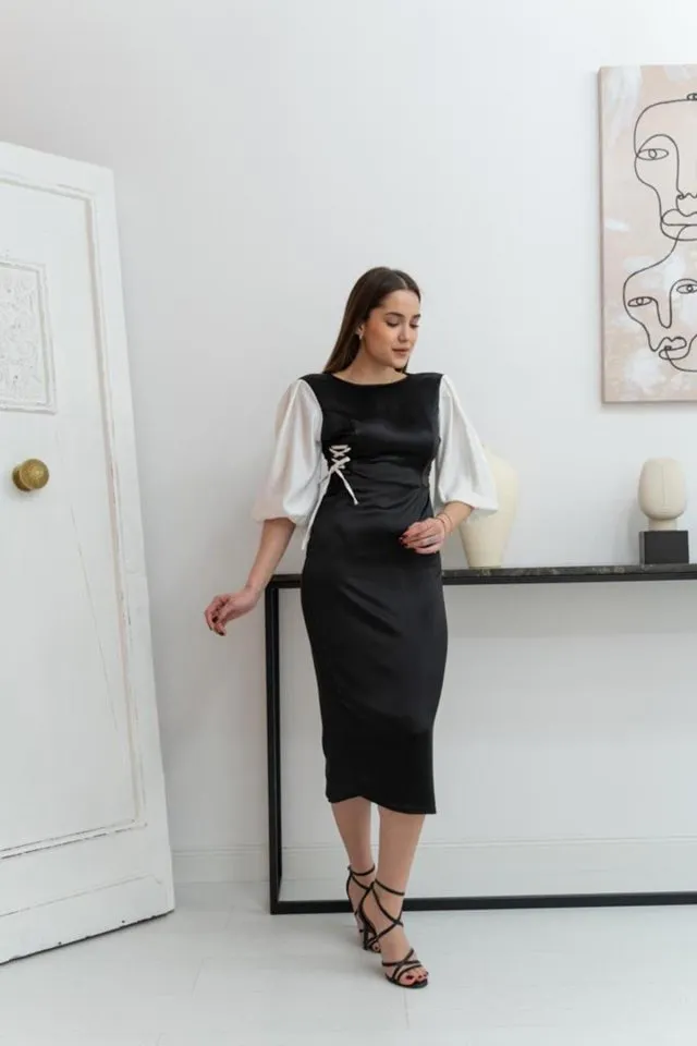 فستان ساندي قصير بياقة عالية وتفاصيل كشكش وطبقات لإطلالة أنثوية أنيقة.