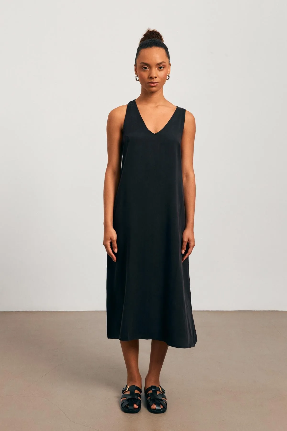 فستان ميدي مودال بياقة V وتفاصيل أزرار ذهبية وقصة ضيقة لإطلالة يومية راقية وأنيقة.