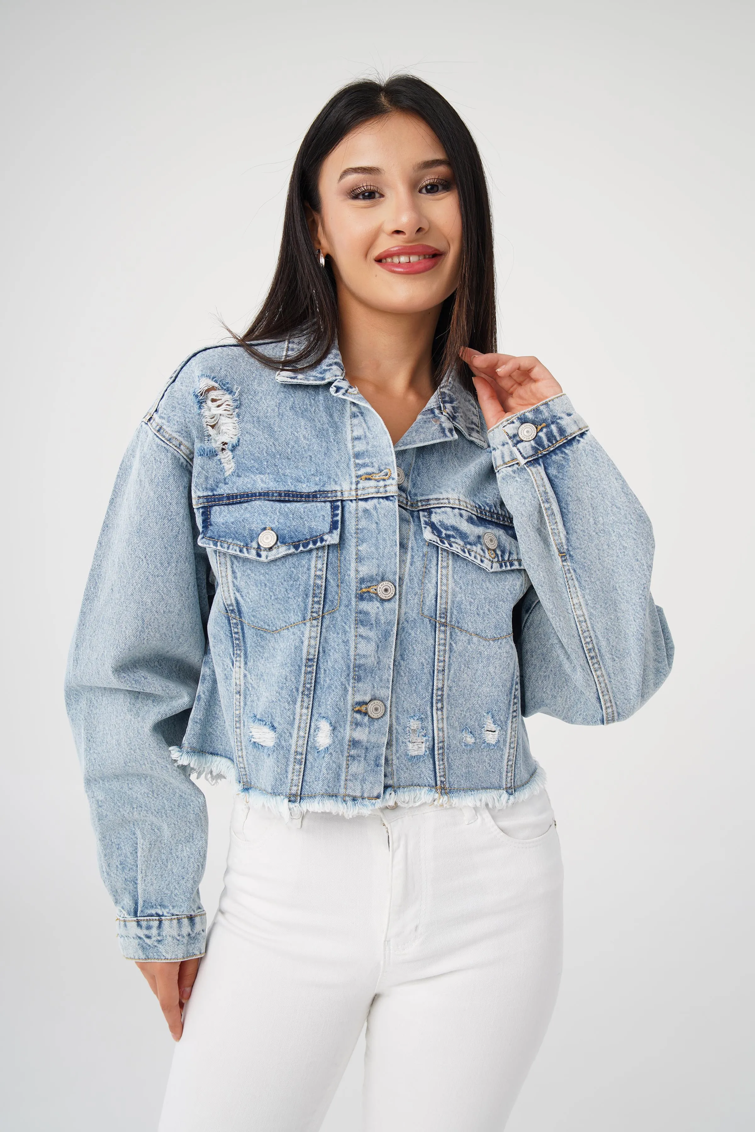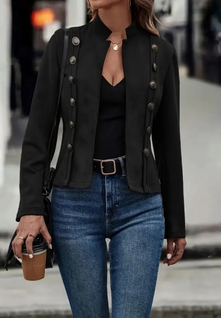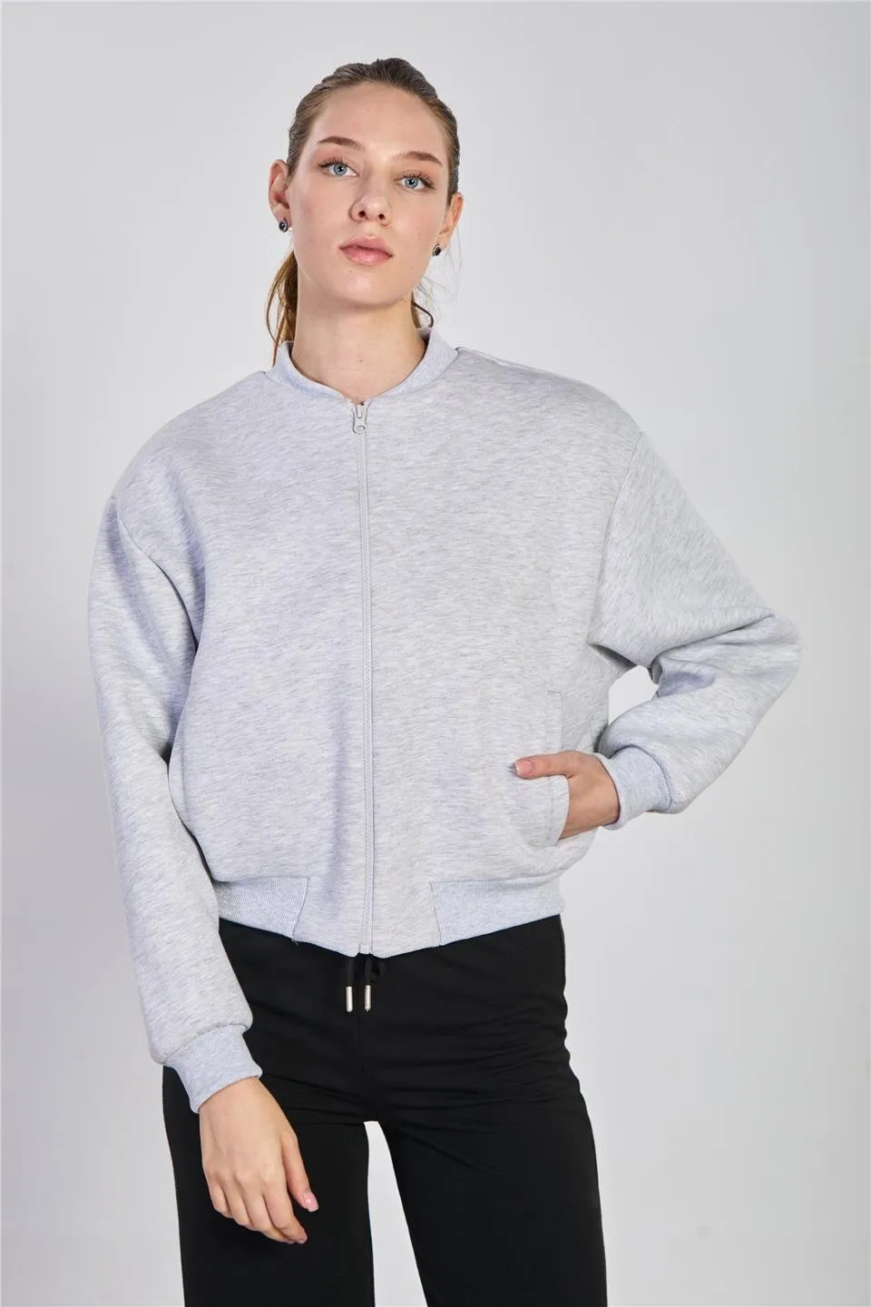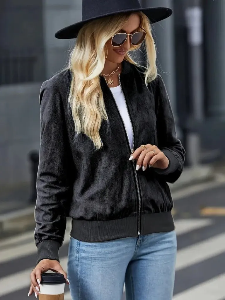 جاكيت نسائي قصير من قماش مودال بتفاصيل لؤلؤ وسحّاب أمامي يمنحك لوك يومي مريح ولمسة أنيقة.