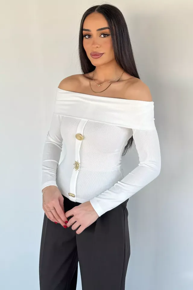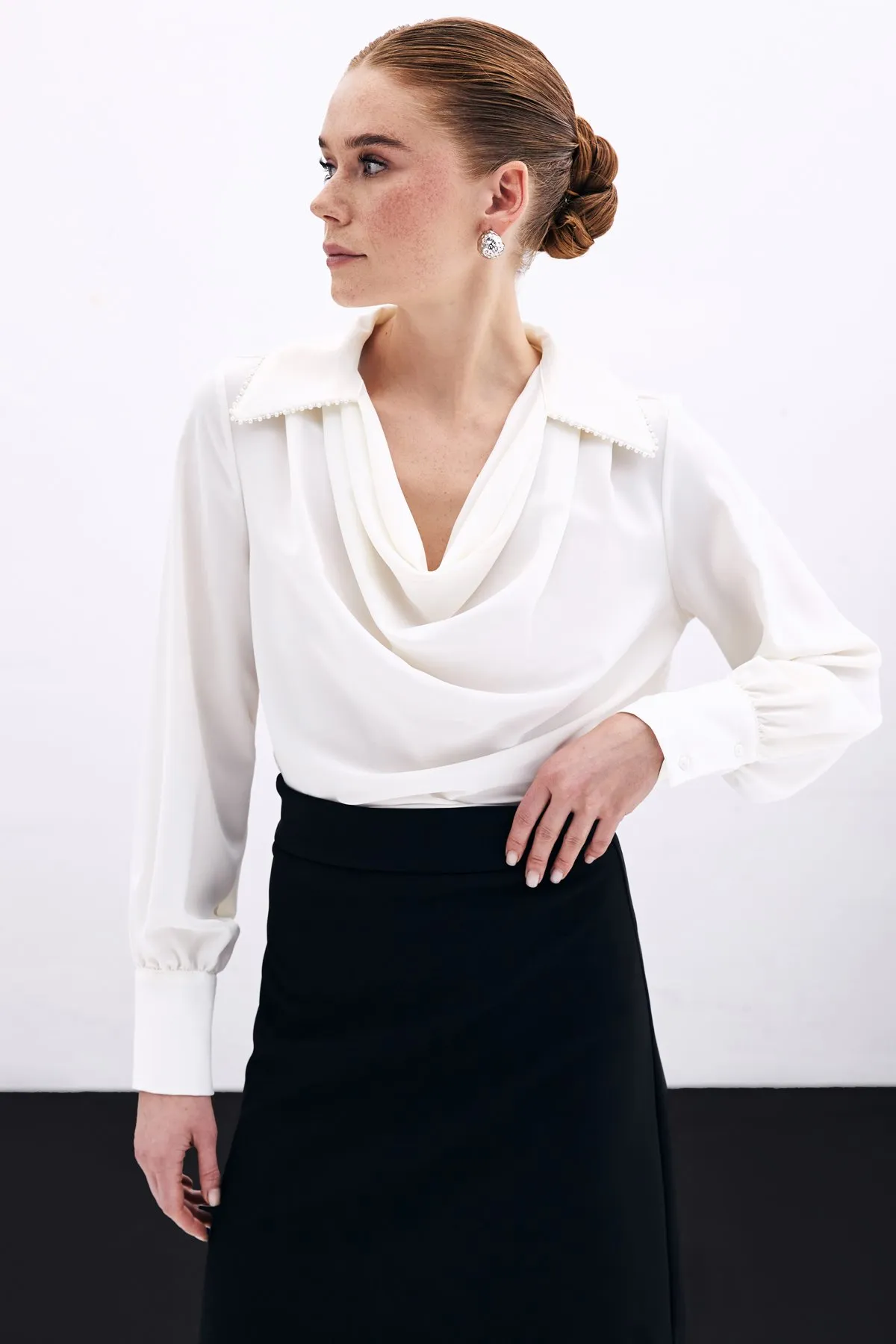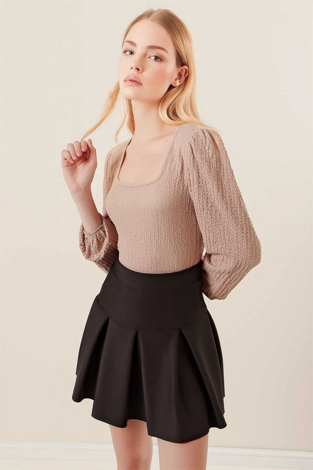 بلوزة مضلعة بياقة عالية وتفاصيل كتلة ألوان وأكمام طويلة لإطلالة أنيقة في الشتاء.