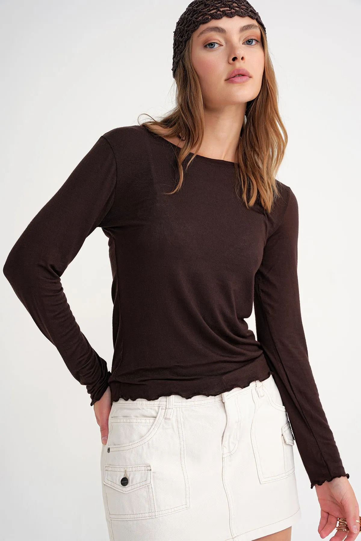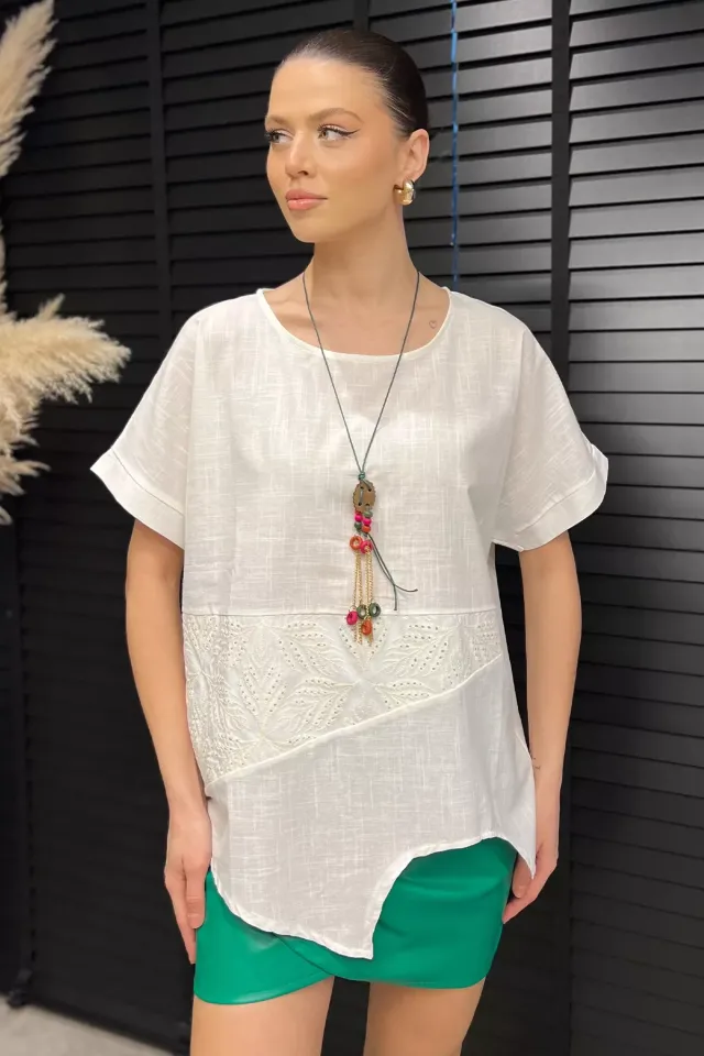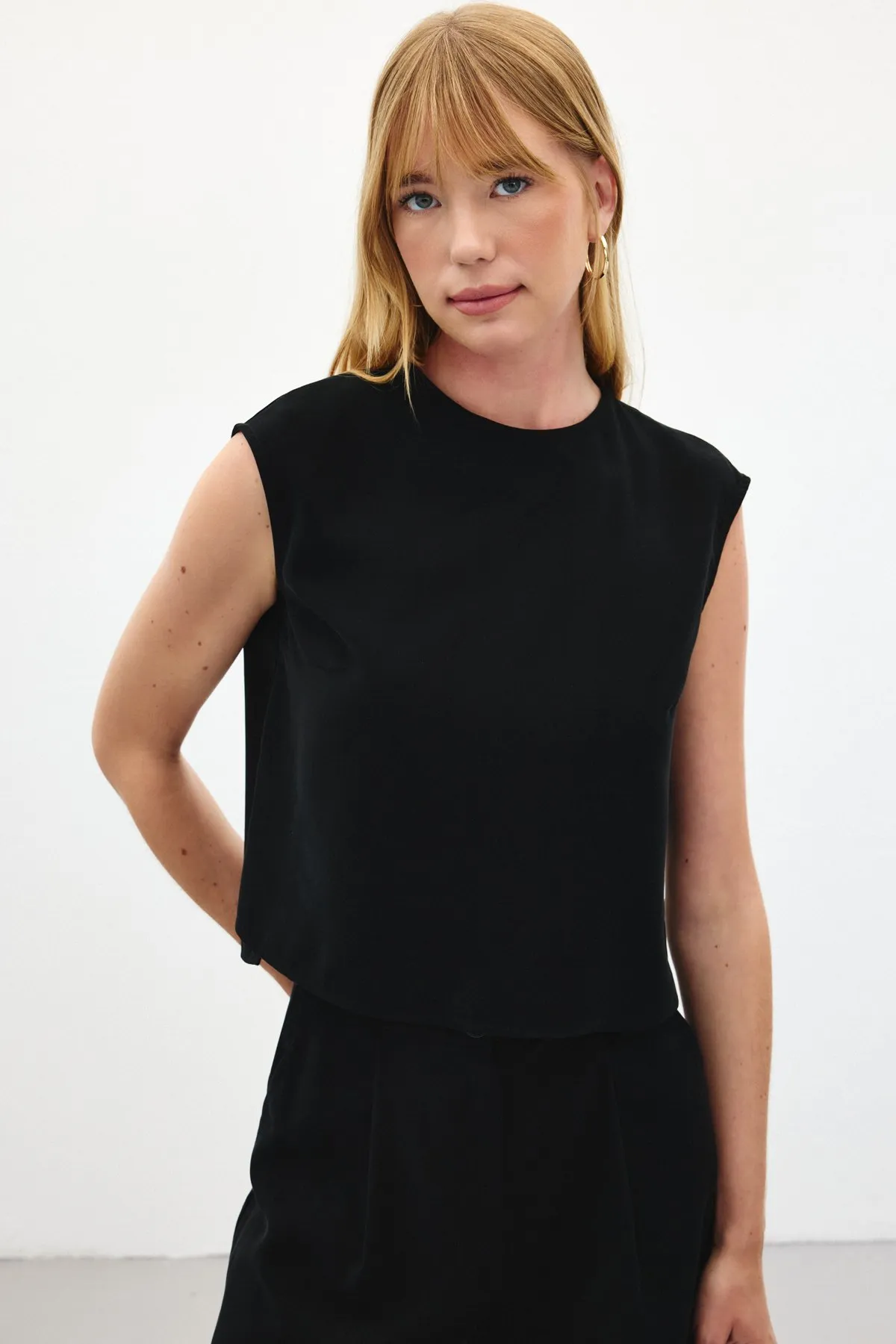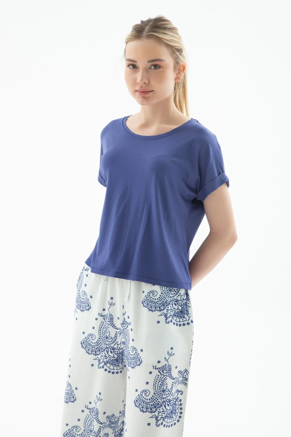 بلوزة بتصميم كتلة ألوان وياقة دائرية مع تفاصيل أزرار لإطلالة كاجوال عصرية.