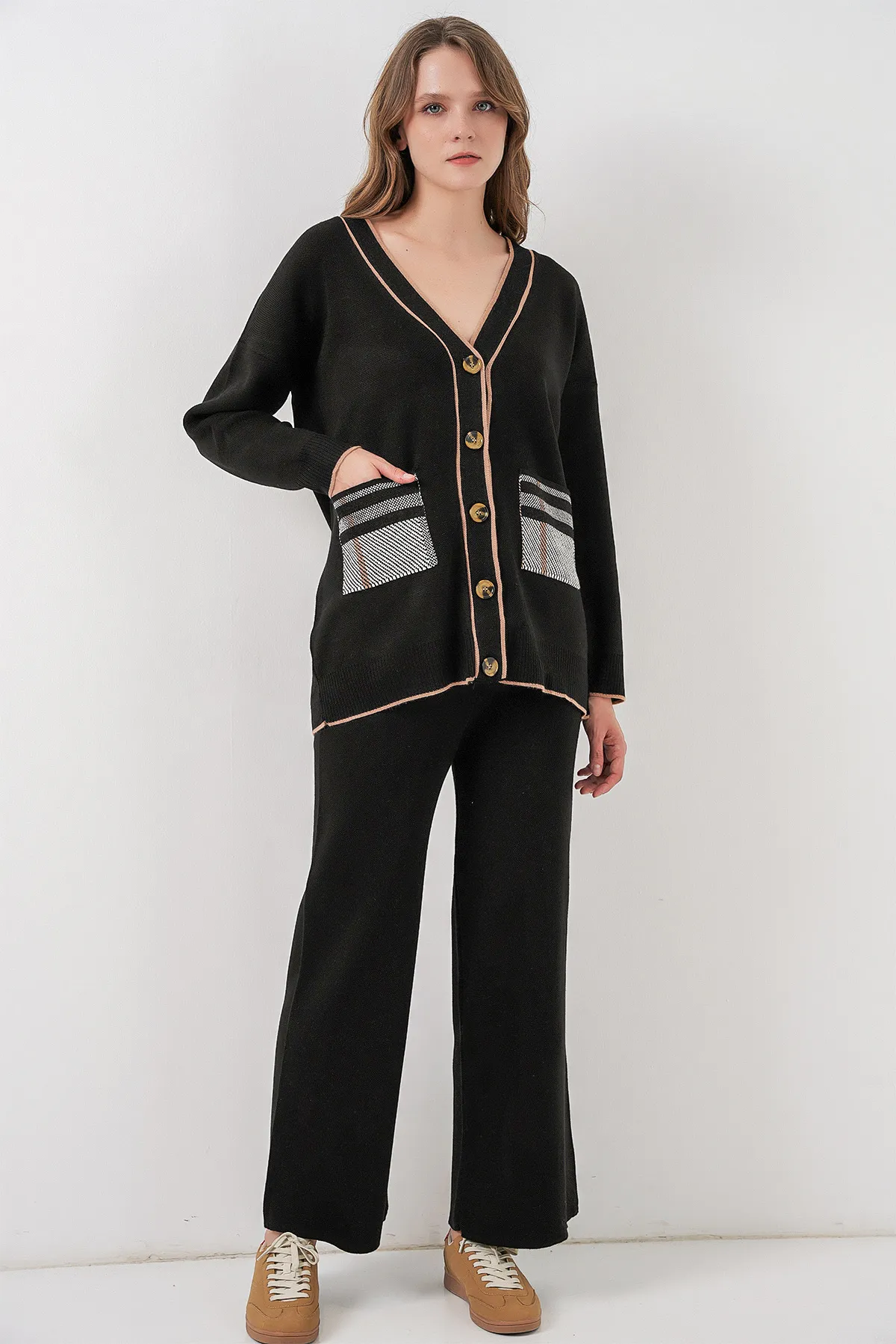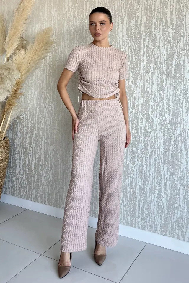 طقم نسائي من قطعتين بقماش كوردروي ناعم يضم قميص بأزرار وبنطلون بخصر مطاطي لراحة وأناقة عصرية.