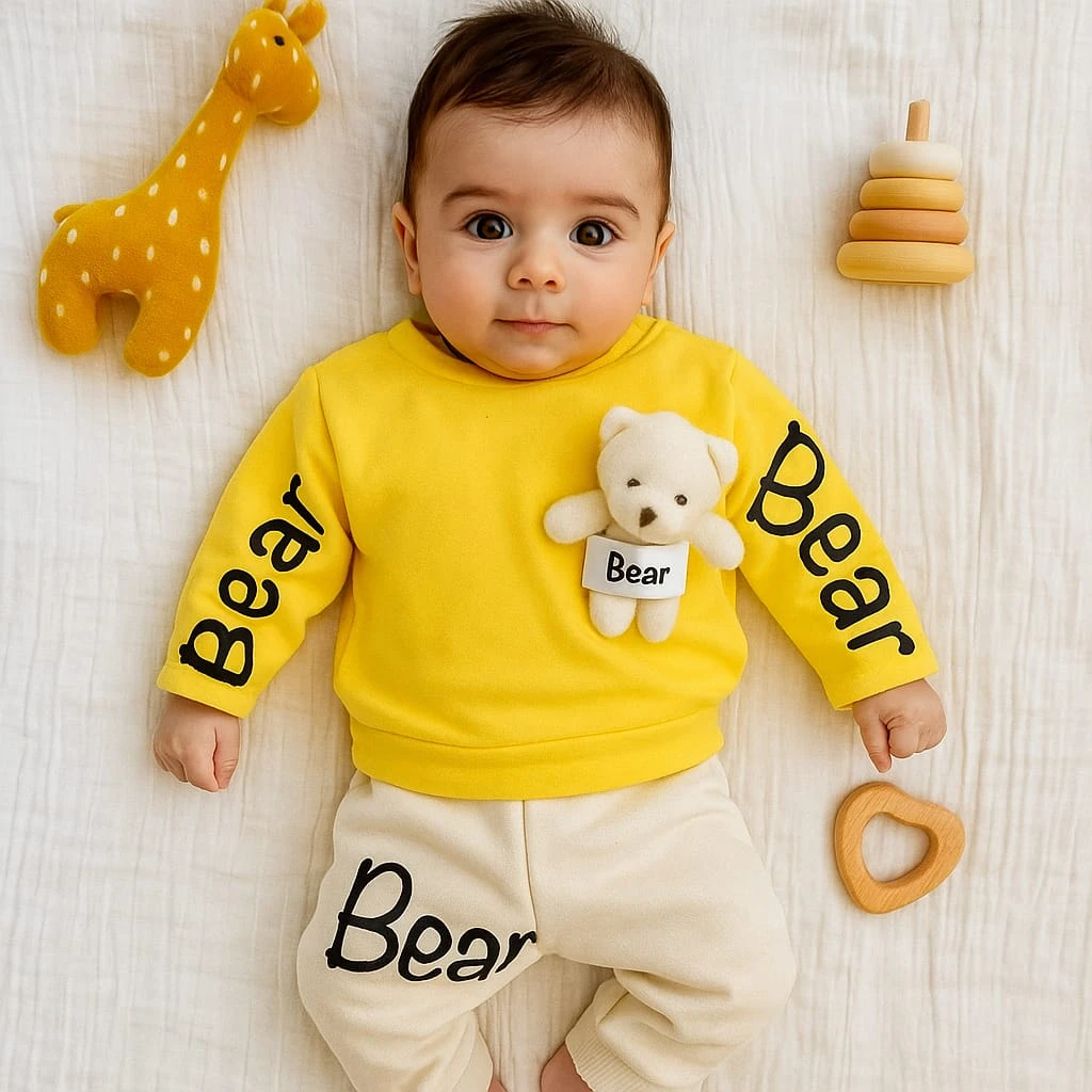 بدلة رياضية من قماش ناعم للأولاد الرضع، تتضمن بلوزة بياقة دائرية مطرزة بشكل لطيف مع بنطلون مريح مطابق. مصنوعة من قماش دافئ وناعم يمنح الطفل راحة ودفئًا خلال المواسم الباردة.