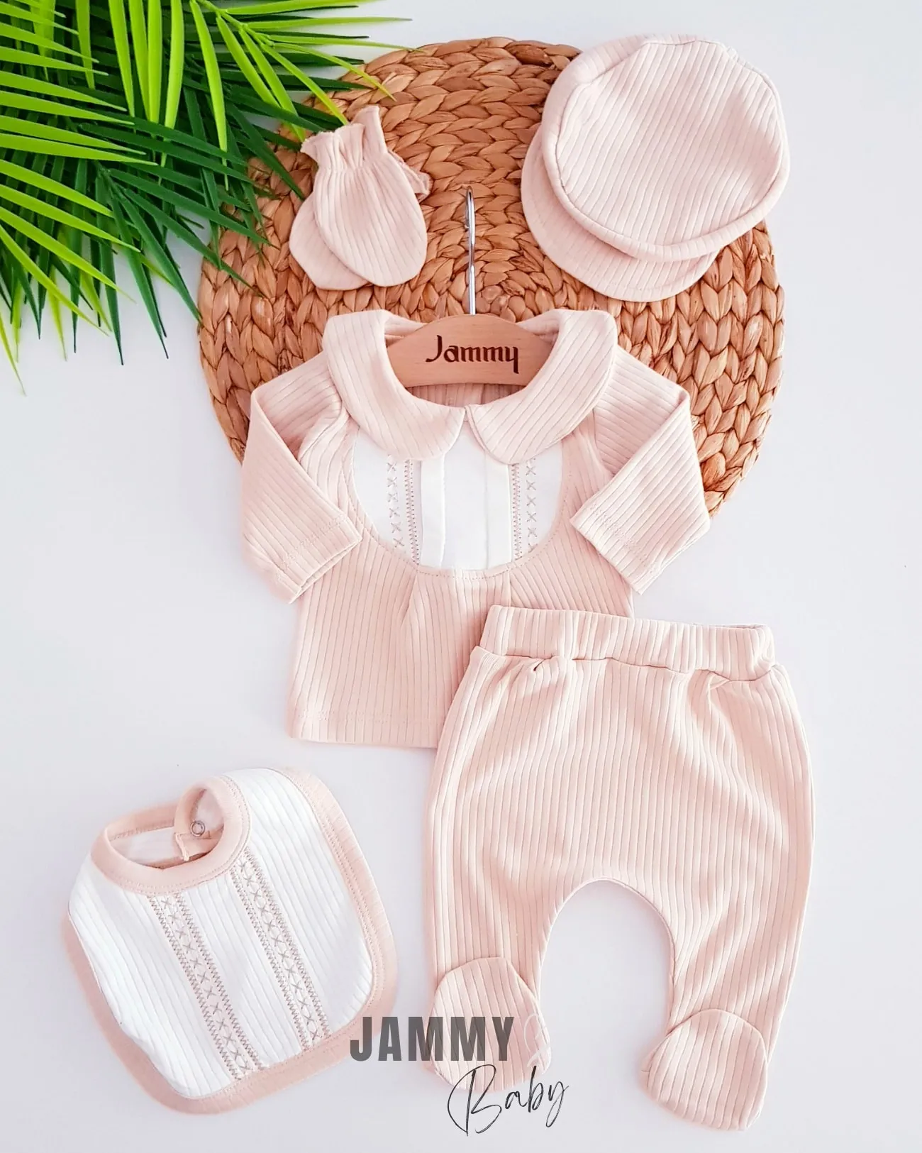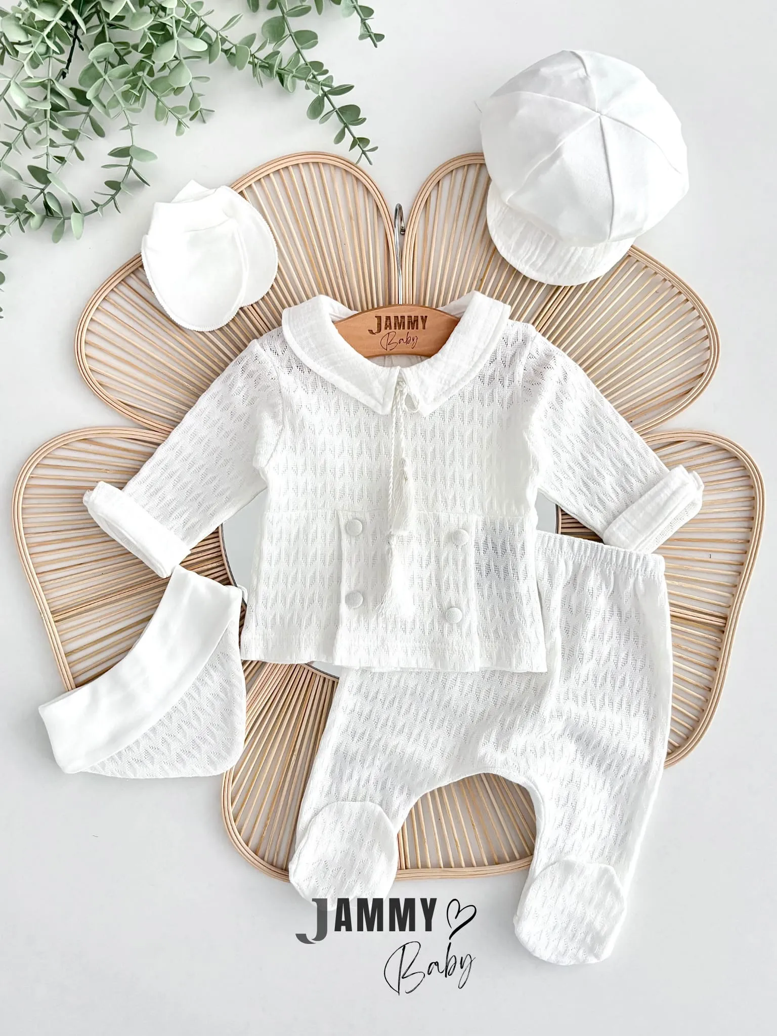 بدلة رياضية من قماش ناعم للأولاد الرضع، تتضمن بلوزة بياقة دائرية مطرزة بشكل لطيف مع بنطلون مريح مطابق. مصنوعة من قماش دافئ وناعم يمنح الطفل راحة ودفئًا خلال المواسم الباردة.
