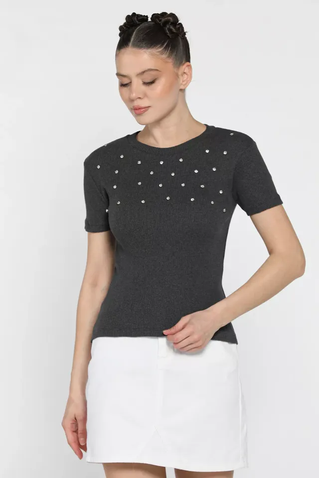 بلوزة تريكو مضلعة بياقة دائرية - Beyond Store
