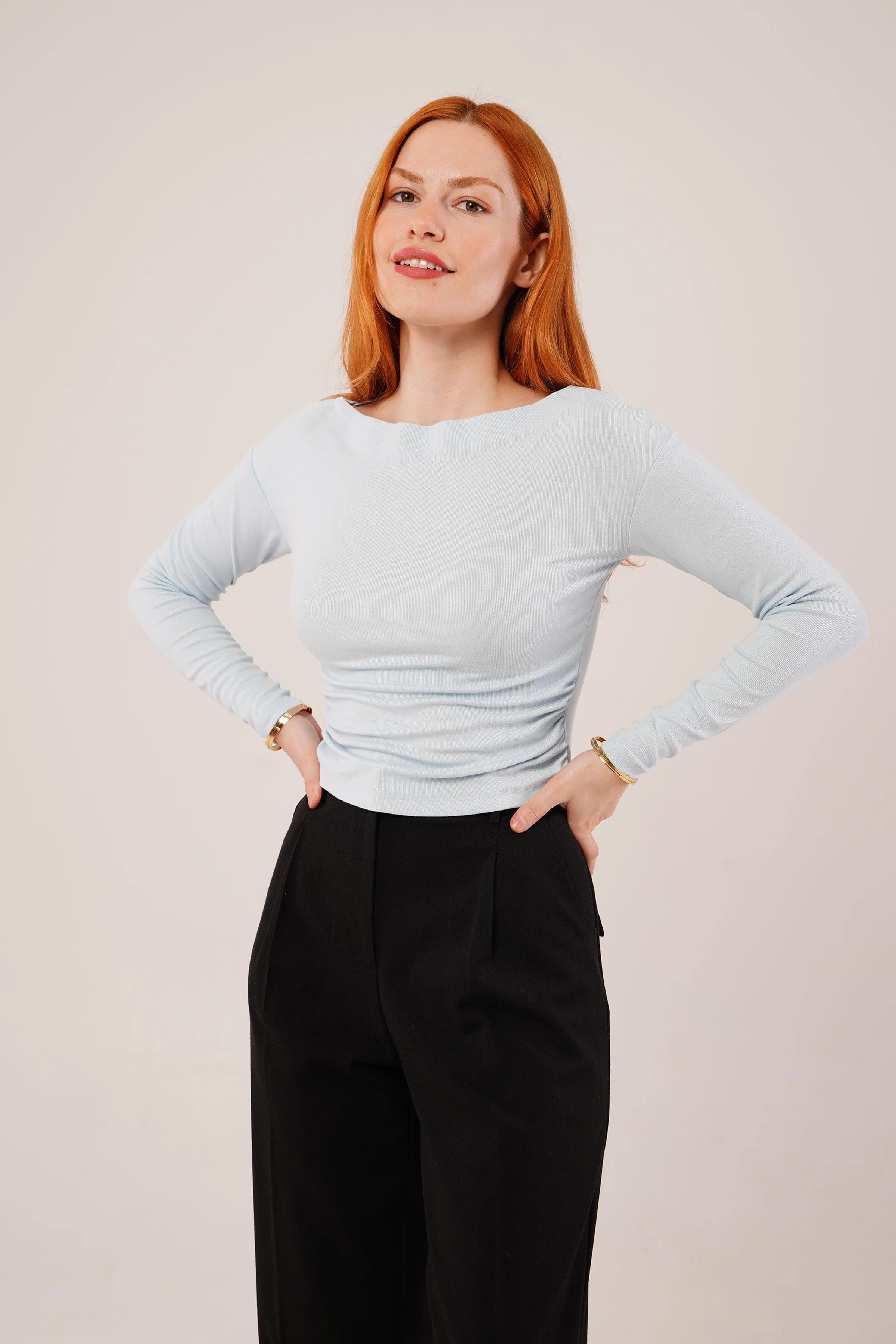 الموديل ترتدي مقاس L/XL — الطول ١٧٢ سم، الصدر ٨٣ سم، الخصر ٧٠ سم، الورك ٩١ سم