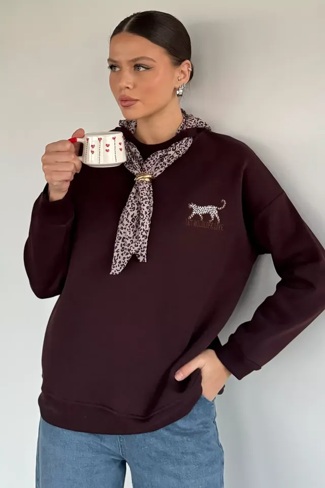 سويت شيرت نسائي بياقة دائرية بطباعة أمامية وتفاصيل حجر الراين لإطلالة شتوية أنيقة ومريحة.