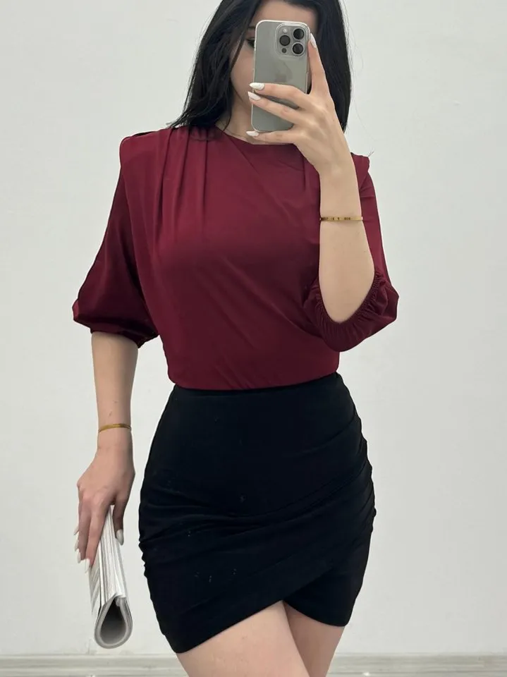 بلوزة بياقة عالية وقصة ضيقة بقماش ناعم مطاطي تعطي لوك يومي بسيط ورايق.