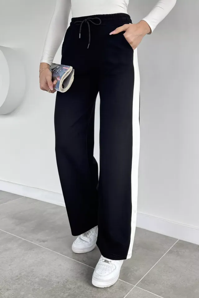 بنطال مريح بقصة واسعة وقماش مضلع مع خصر مطاطي وجيوب لإطلالة يومية سهلة وشيك.