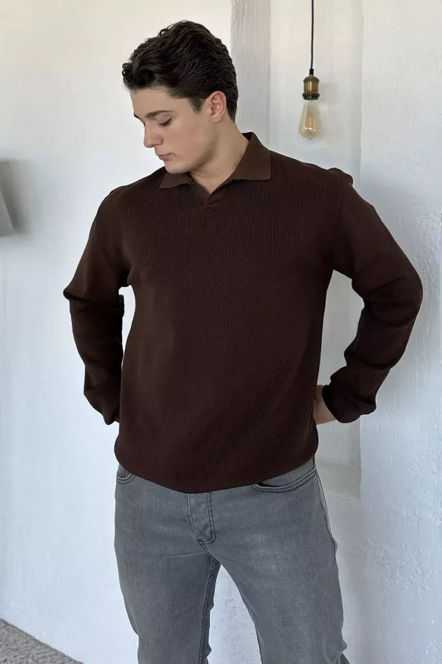 سترة رجالية مضلعة بأكمام طويلة وياقة بولو بسحاب وقصّة مريحة - Beyond Store