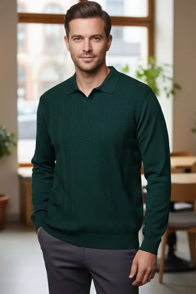 سترة رجالية مضلعة بأكمام طويلة وياقة بولو بسحاب وقصّة مريحة