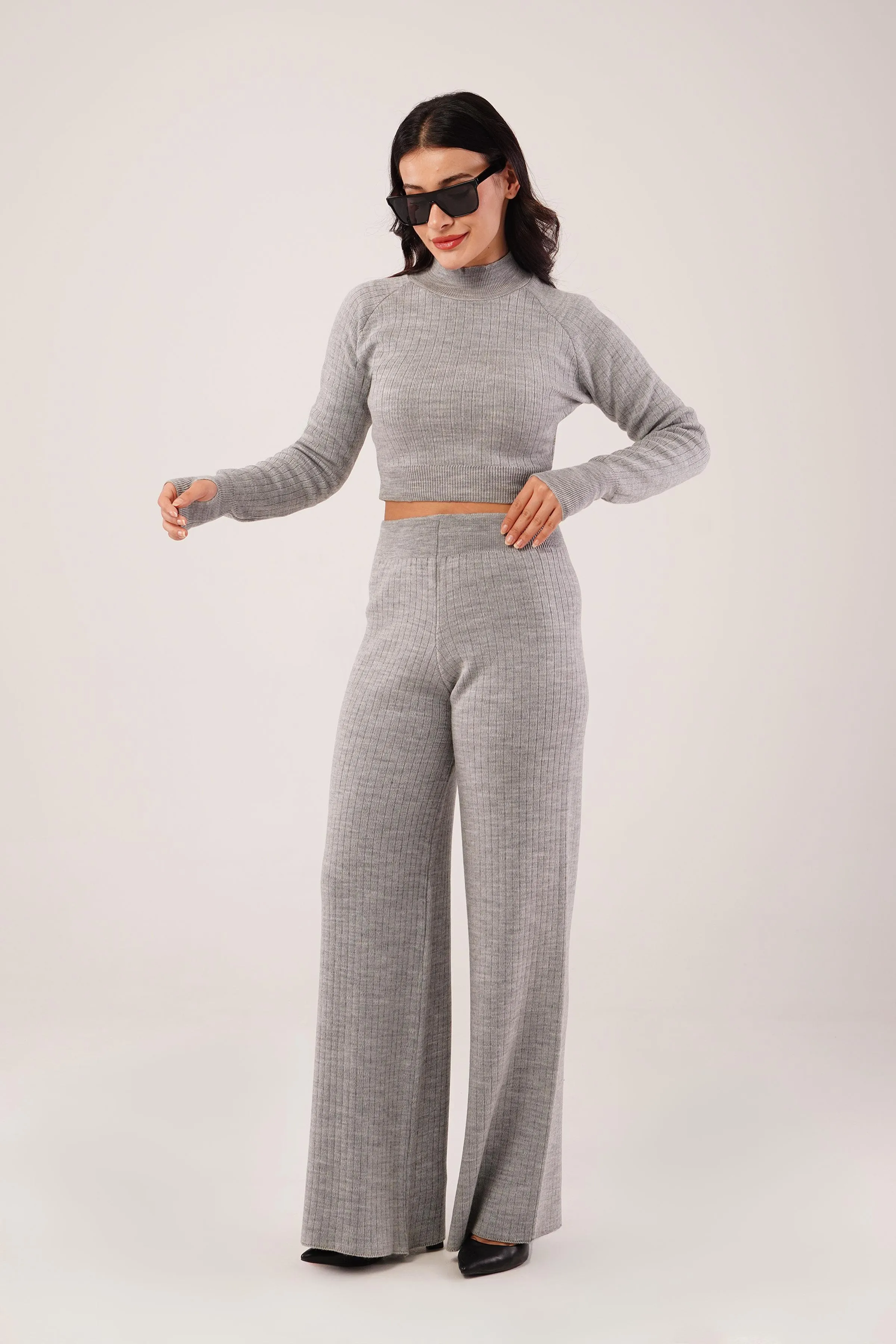 طقم نسائي بسويت شيرت بسحّاب أمامي وياقة عالية مع بنطال بالازو واسع لراحة يومية بستايل عصري ومريح.