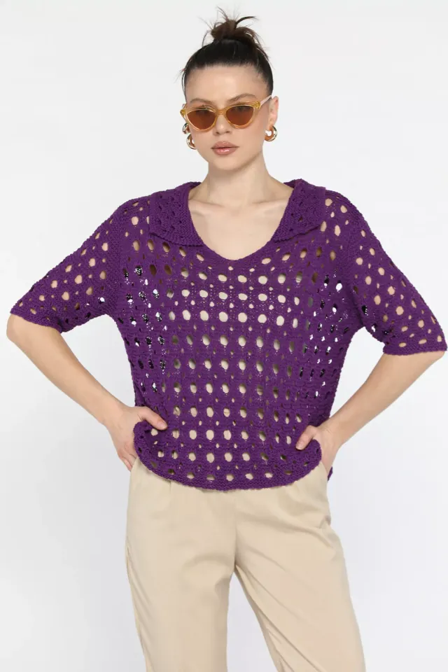 بلوزة تريكو بياقة V ودانتيل على الأكمام للنساء - Beyond Store