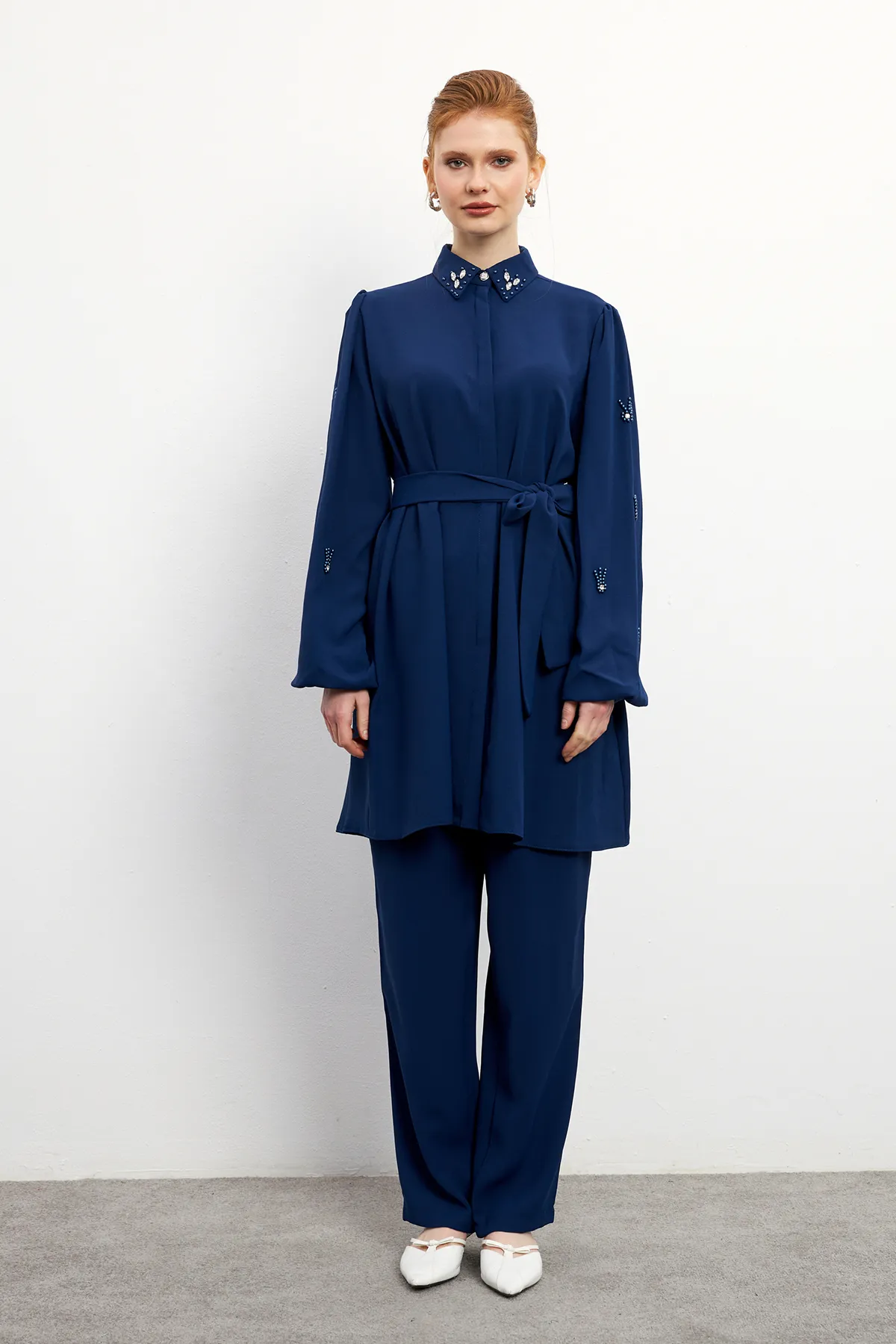 طقم محتشم بتونيك بخطوط وبنطال واسع