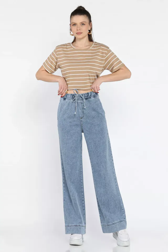 بنطال جينز نسائي بخصر عالي وقصة بالازو واسعة مع مرونة مريحة لإطلالة يومية أنيقة وعصرية.