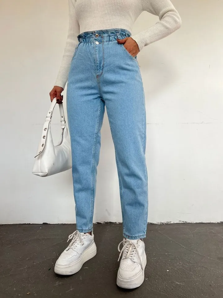 بنطال جينز بخصر عالي وقصة موم