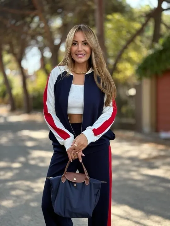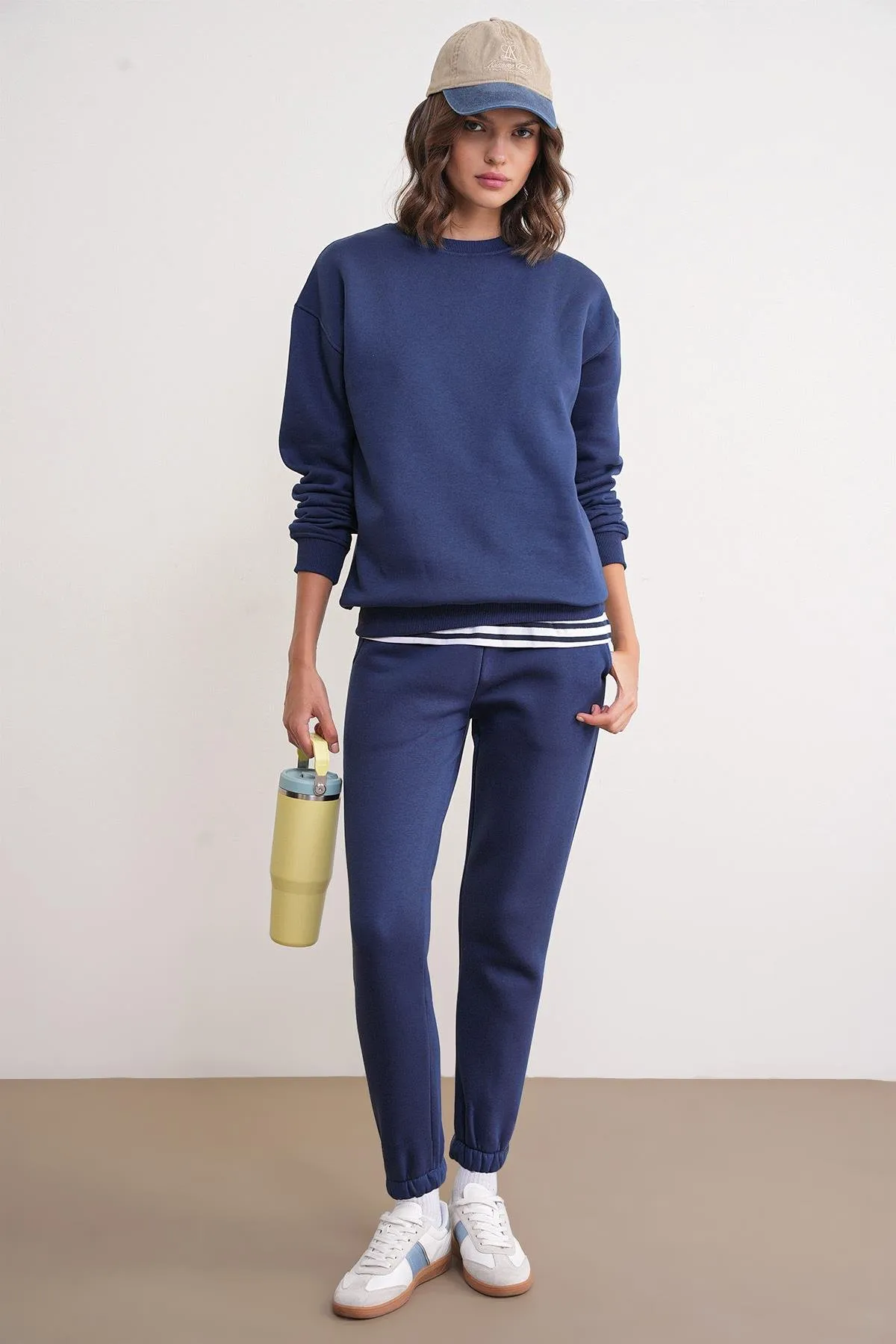 طقم نسائي مريح ببلوزة سويتر بياقة عالية بسحّاب نصف مع كتف منخفض وبنطال بالازو واسع لستايل يومي شيك ومريح.