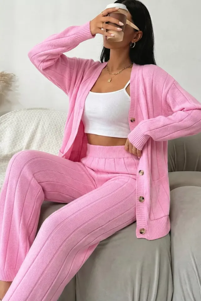 طقم نسائي مريح ببلوزة سويتر بياقة عالية بسحّاب نصف مع كتف منخفض وبنطال بالازو واسع لستايل يومي شيك ومريح.