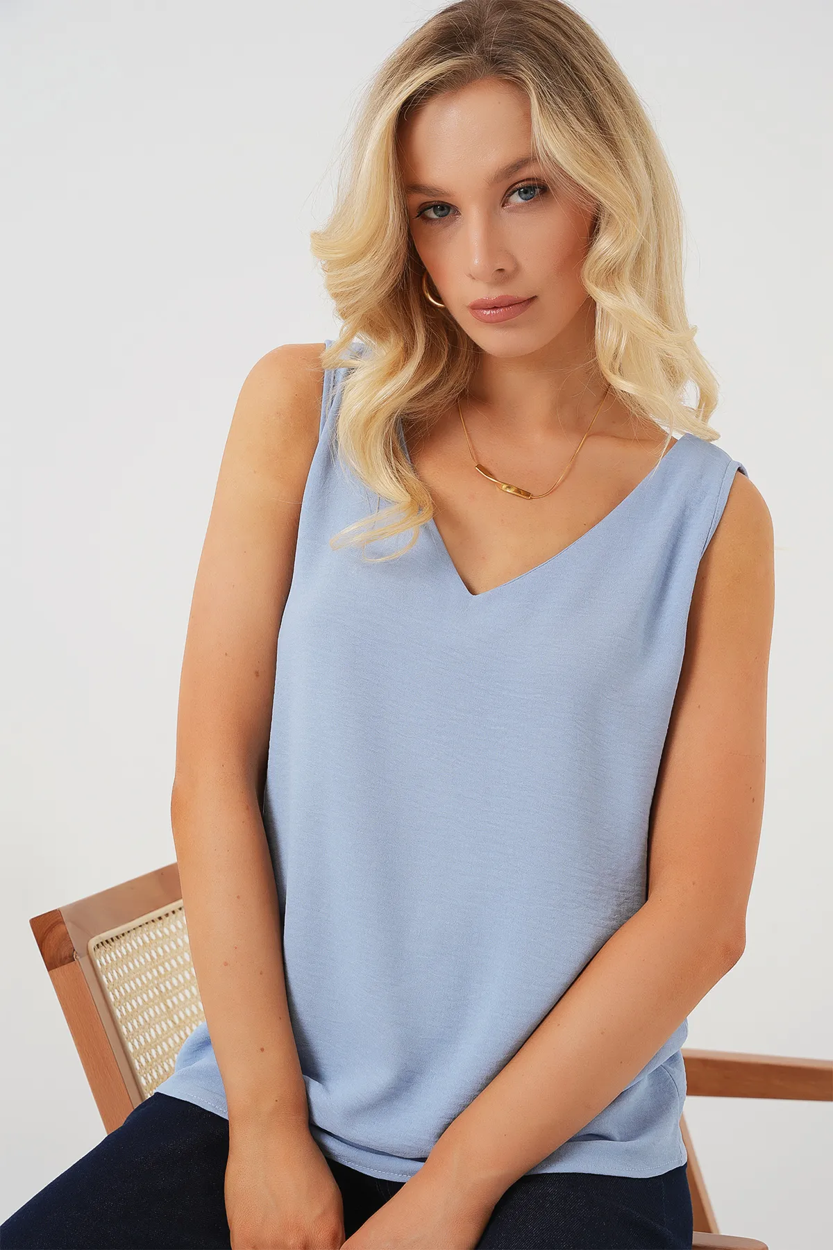 بلوزة نسائية أنيقة بياقة غير متماثلة وتفصيلة خصر مجمّع مع إكسسوار معدني لإطلالة يومية شيك.