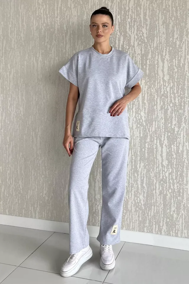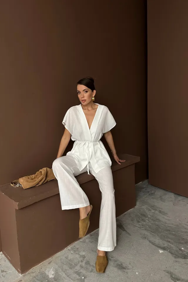 طقم نسائي مريح من قطعتين ببلوزة بنقشة وبنطال بخصر عالٍ لِلوك يومي عصري وسهل التنسيق.