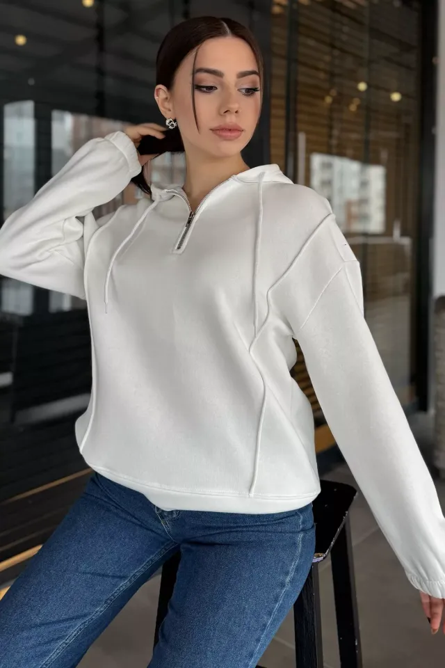 سويت شيرت نسائي من الفليس بسحاب نصف أمامي ونقشة قبلية وياقة عالية لإطلالة شتوية مريحة وأنيقة.