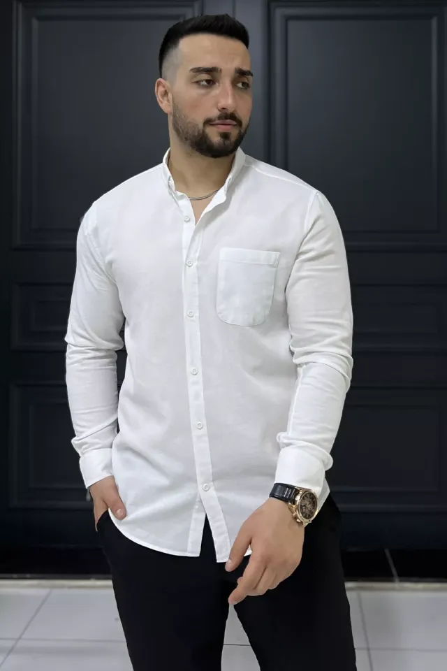 قميص رجالي رسمي كلاسيكي بأكمام طويلة مع أزرار أمامية وجيب عملي، مصنوع من 98% قطن و2% ليكرا، يوفر نعومة طبيعية ومرونة خفيفة ومظهرًا أنيقًا للاستخدام الرسمي.