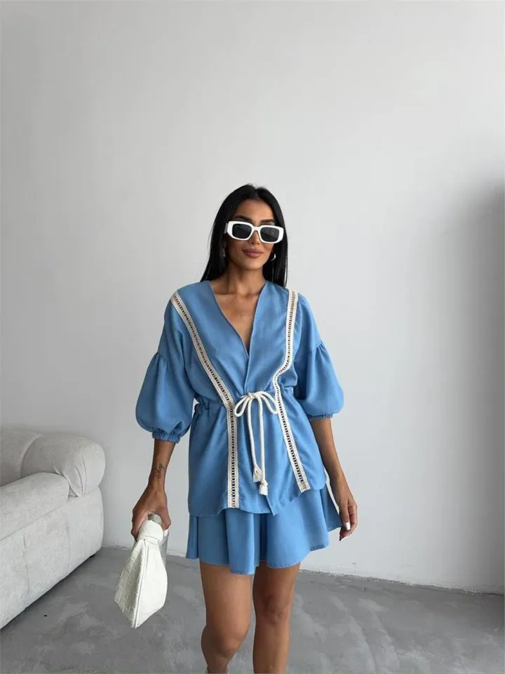 طقم صيفي عملي يتكوّن من بلوزة بحمالات قابلة للتعديل وشورت مريح بخصر مطاطي لإطلالة يومية وخيار مناسب للعطلات.