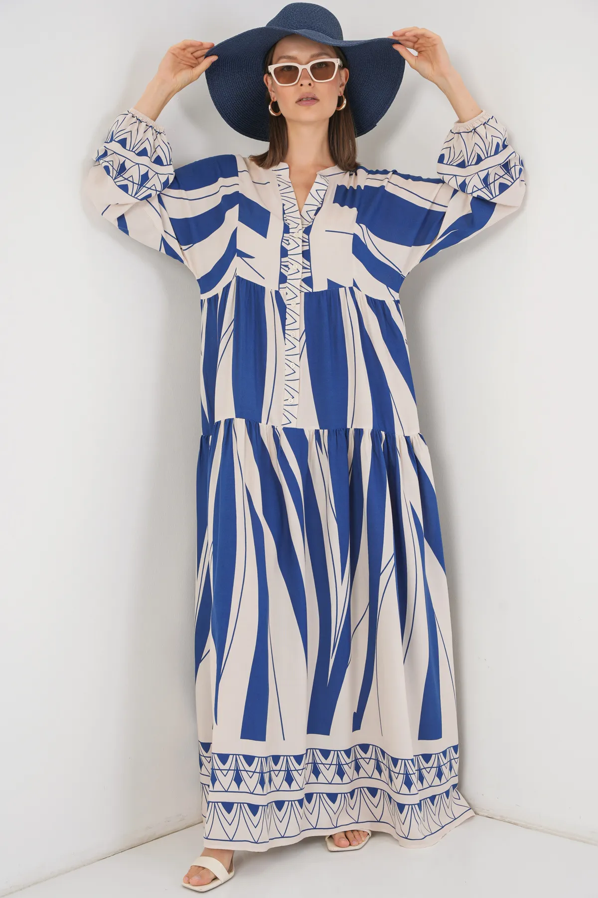 فستان ماكسي منقوش بأكمام منفوخة وأزرار أمامية للنساء، يجمع بين الاحتشام والأناقة العصرية.