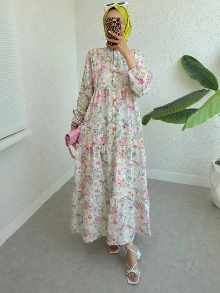 فستان ماكسي منقوش بأكمام منفوخة وأزرار أمامية للنساء، يجمع بين الاحتشام والأناقة العصرية.
