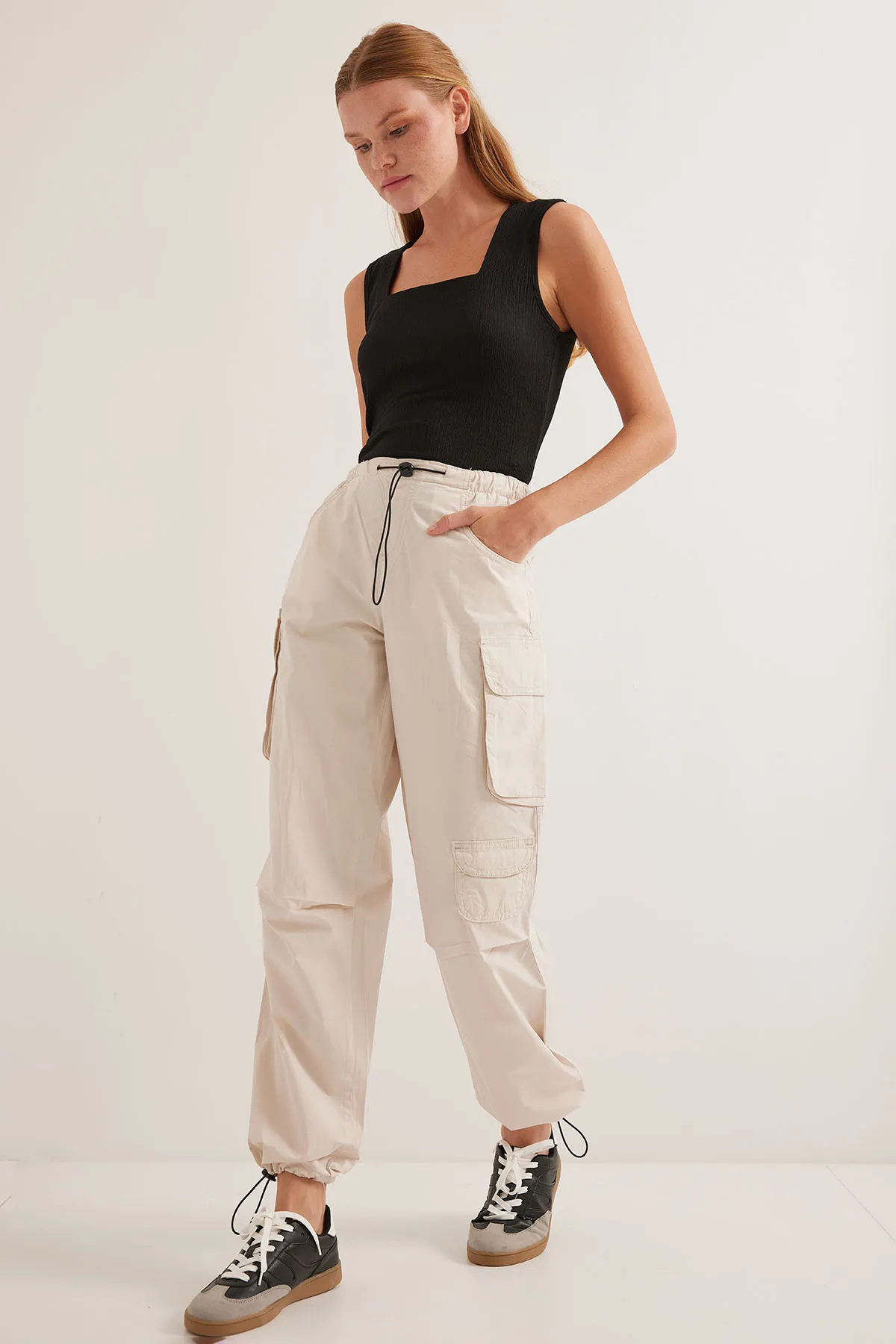 الموديل ترتدي مقاس M – الطول 172 سم، الوزن 53 كغ، الصدر 83 سم، الخصر 70 سم، الورك 91 سم