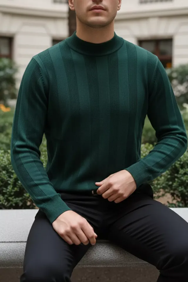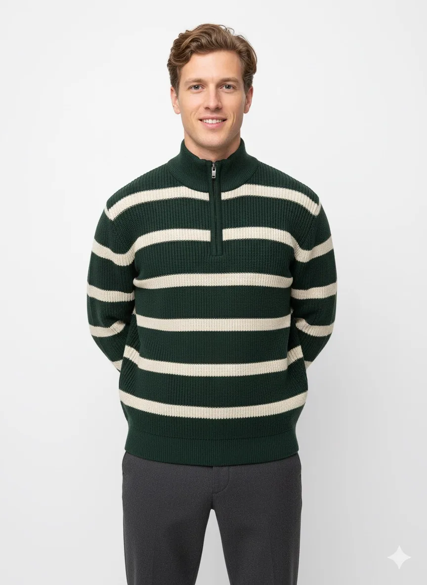 سويتر رجالي محبوك بياقة بولو بتصميم مضلع ونقوش خطوط أنيقة، مصنوع من قماش ناعم ودافئ يمنحك الراحة والمظهر العصري في المواسم الباردة.