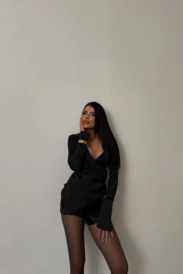 الموديل ترتدي مقاس 36 – الطول 172 سم، الوزن 53 كغ، الصدر 83 سم، الخصر 70 سم، الورك 91 سم