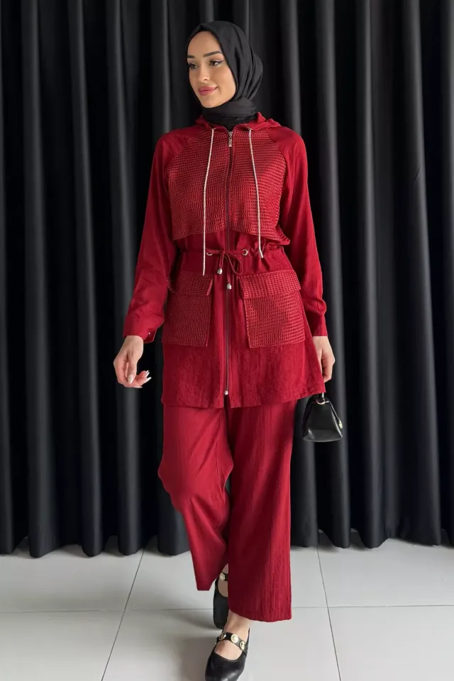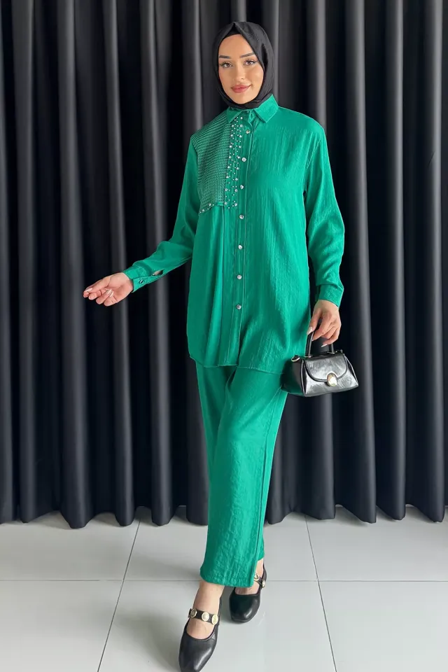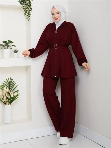 طقم نسائي أنيق مكون من قطعتين، تونيك بأكمام طويلة مزين بأزرار ذهبية وتفاصيل رباط على الخصر، مع بنطلون متناسق. مصنوع من قماش ناعم ومريح يمنح إطلالة محتشمة وأنيقة بكل سهولة.