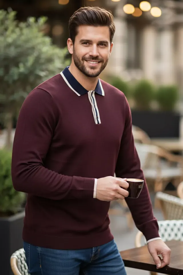 سويتر رجالي محبوك مضلع بياقة بولو ونصف سحاب مع تفاصيل خطوط أنيقة، مصنوع من قماش ناعم ودافئ بأكمام طويلة، يوفر الراحة ومظهرًا عصريًا كاجوال للمواسم الباردة.