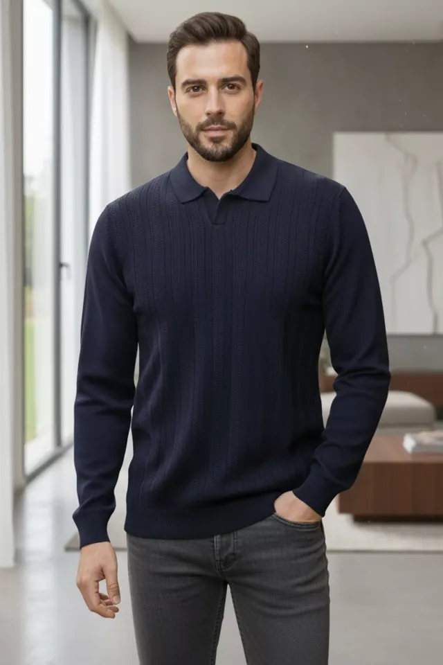 سويتر رجالي محبوك مضلع بياقة بولو ونصف سحاب مع تفاصيل خطوط أنيقة، مصنوع من قماش ناعم ودافئ بأكمام طويلة، يوفر الراحة ومظهرًا عصريًا كاجوال للمواسم الباردة.