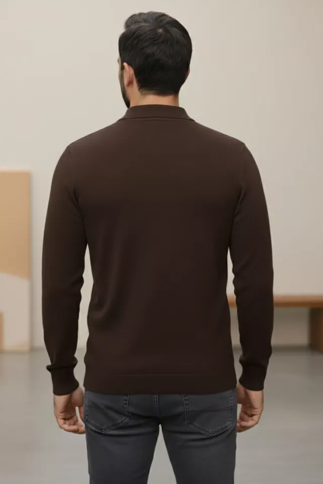 سترة رجالية كلاسيكية محبوكة بياقة بولو، مصنوعة من مزيج ناعم من البوليستر والفيسكوز مع مرونة خفيفة. دافئة وخفيفة الوزن، ومثالية للارتداء اليومي الأنيق في الأجواء الباردة.