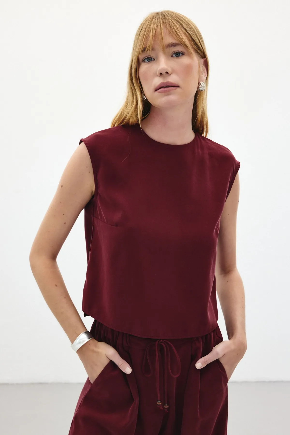 بلوزة نسائية قصيرة بدون أكمام بتفاصيل مرصعة بالأحجار اللامعة وقصة عصرية تمنح إطلالة أنثوية جذابة ولافتة.