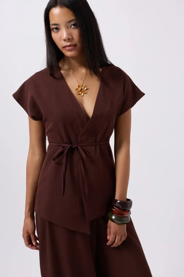 يليق كيوت وصيفي بقصة كروب مع ربطة أمامية وياقة V لستايل يومي مريح.