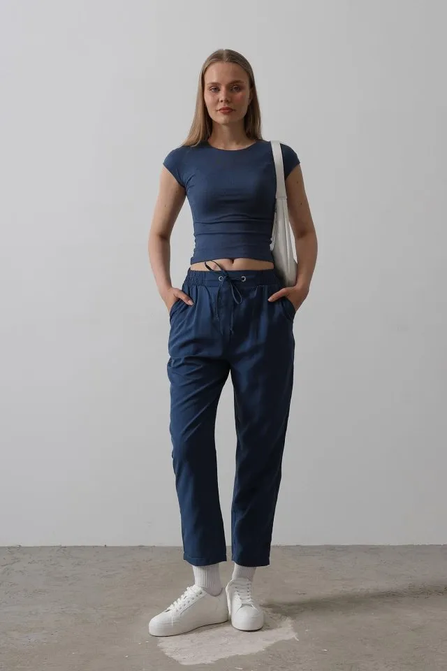بنطلون نسائي بخصر عالي وقصة عادية مع تفصيل خياطة لستايل يومي عملي وعصري.
