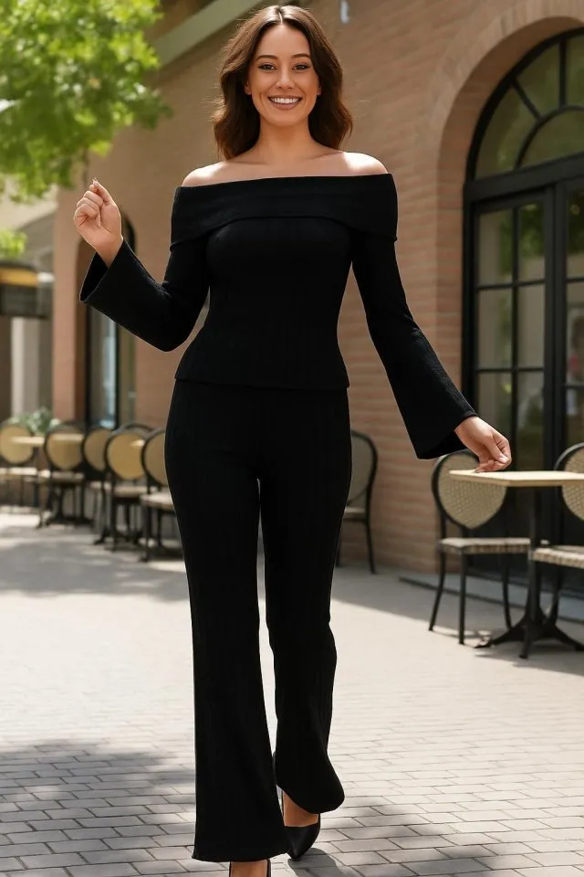 طقم بكارديغان مزين بحجر وبنطال خصر عالي - Beyond Store