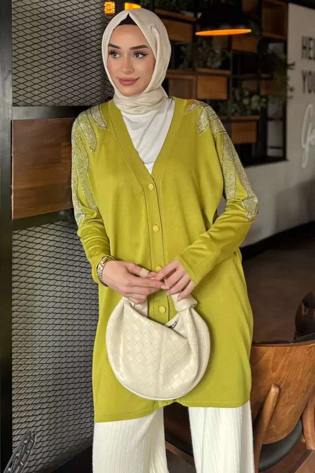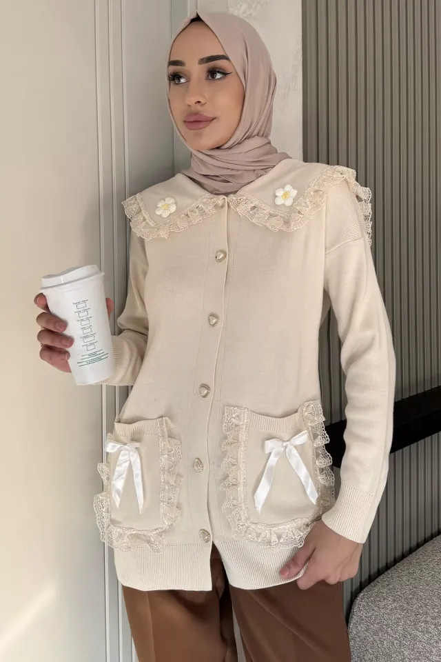 كارديجان نسائي محبوك بأزرار أمامية وجيبين، مزين بتطريز أنيق لإطلالة عملية وعصرية.