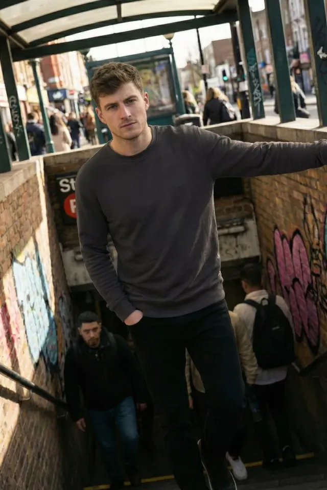 سويت شيرت رجالي بياقة دائرية وأكمام طويلة مع تفاصيل طبعة أنيقة، مصنوع من قماش ناعم ومريح، يوفر الراحة ومظهرًا عصريًا كاجوال للإطلالات اليومية.