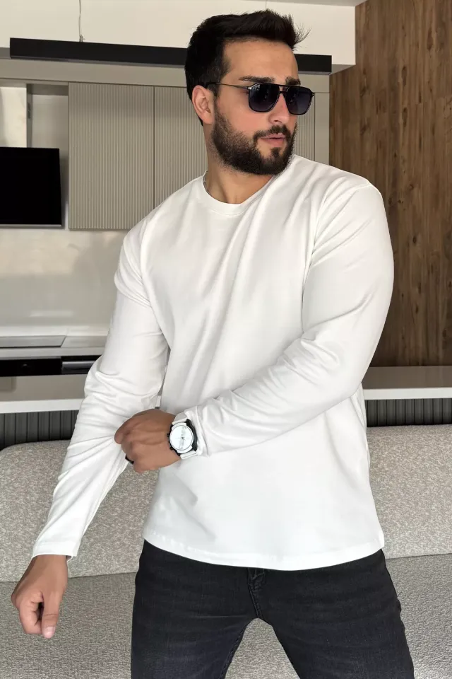 سويت شيرت رجالي بياقة دائرية وأكمام طويلة مع طبعة حروف أمامية أنيقة، مصنوع من قماش ناعم ومريح، يوفر الراحة ومظهرًا عصريًا كاجوال للإطلالات اليومية.