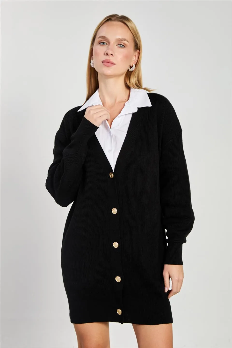 كارديغان تريكو نسائي مريح بنمط محبوك وتفاصيل أزرار أمامية لستايل يومي خفيف وعصري.