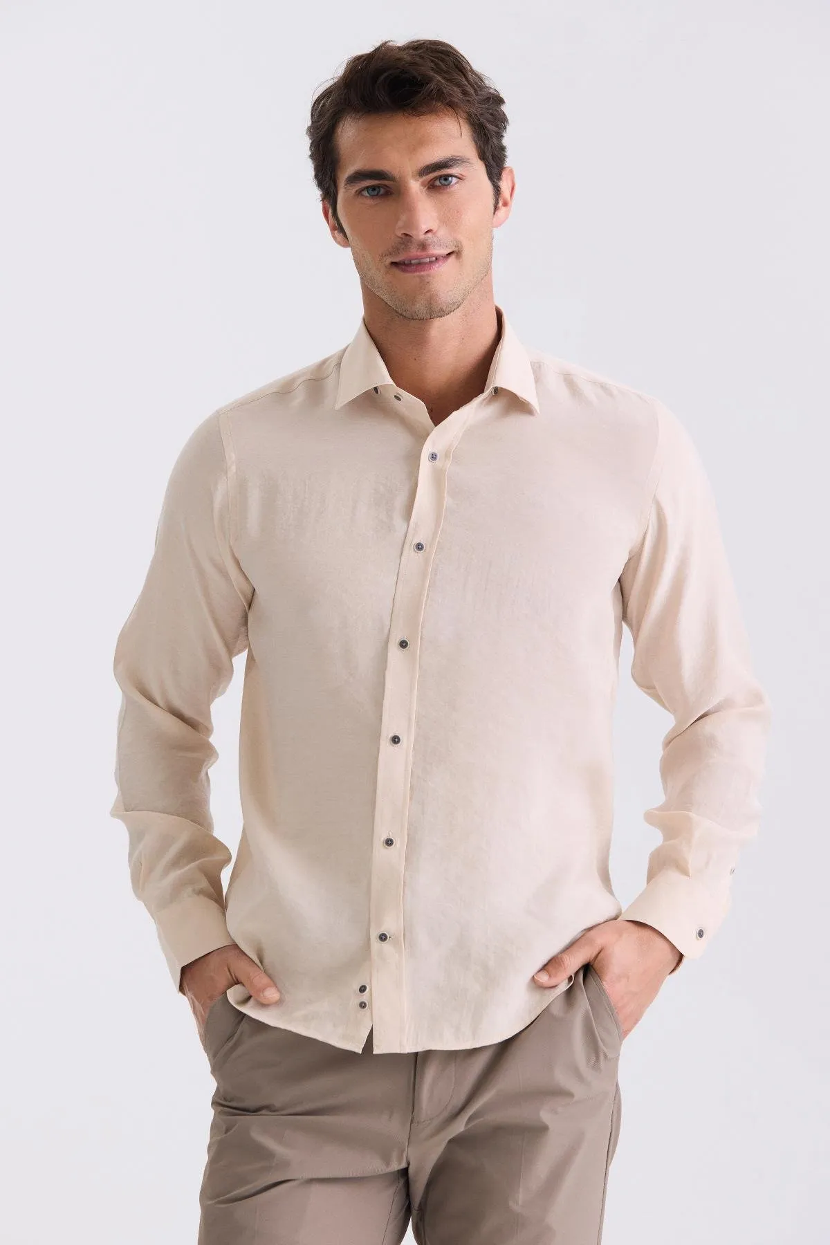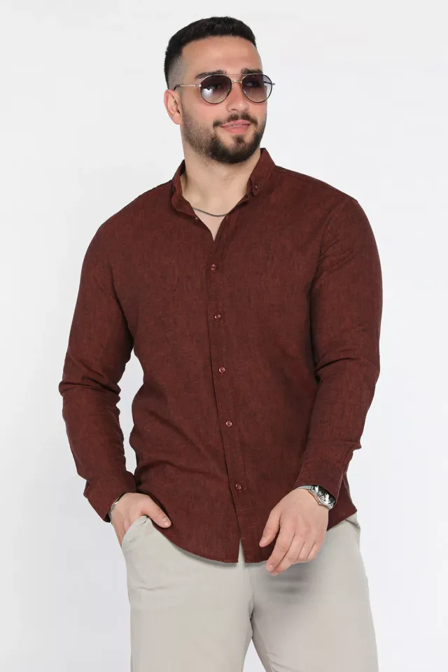 قميص رجالي كاجوال بأكمام طويلة مع أزرار أمامية، مصنوع من مزيج بوليستر وفيسكوز مع إيلاستين، يوفر نعومة خفيفة ومرونة عملية وثبات شكل بمظهر مرتب للتنسيق اليومي.