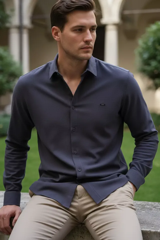 قميص رجالي كاجوال بأكمام طويلة مع أزرار أمامية، مصنوع من مزيج بوليستر وفيسكوز مع إيلاستين، يوفر نعومة خفيفة ومرونة عملية وثبات شكل بمظهر مرتب للتنسيق اليومي.
