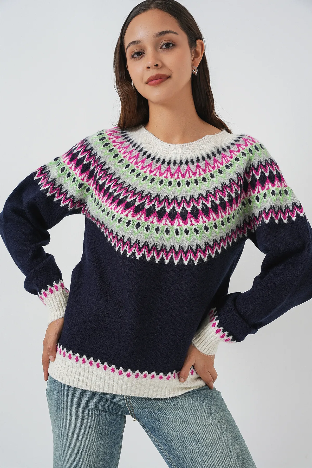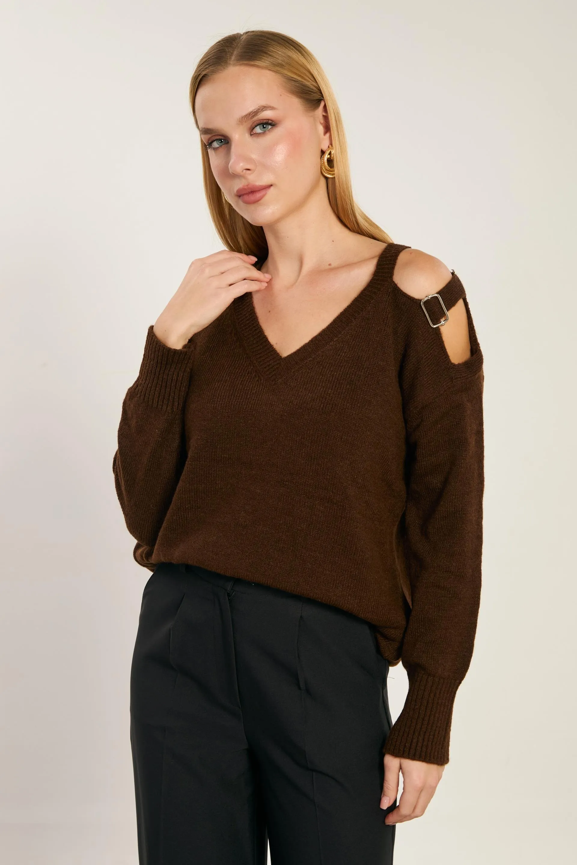 كنزة تريكو نسائية بكتف مكشوف وتفصيل سلسلة لإطلالة يومية دافئة وشيك.