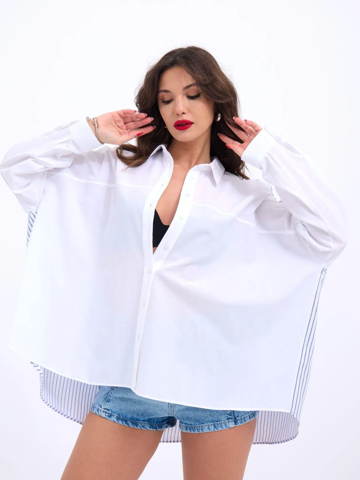 قميص نسائي مريح بنقشة مربعات وبقصة واسعة من قماش قطني ناعم لإطلالة يومية أنيقة ومريحة. ٪65 قطن، ٪35 بوليستر غير مبطن، إغلاق بأزرار أمامية الطول: 70 سم، طول الكم: 45 سم الموديل ترتدي مقاس 38 – الطول 176 سم، الصدر 90 سم، الخصر 63 سم، الورك 94 سم